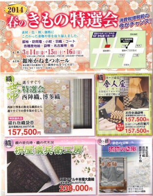 JUGEMテーマ:お着物&浴衣 年に一度の、銀座会場での展示会のお知らせです。 『2014 春のきもの特選会』 とき:2014年3月14日(金)午前11時〜午後7時 15日(土)午前10時〜午後7時 16日(日)午前10時〜午後5時 ところ:銀座かねまつホール 中央区銀座6-9-9(銀座かねまつビル5階)03-3572-6285 *期間中、京橋店はお休みとなりますのでご注意ください。 *展示会場にて、出来上がり品のお引き取りご希望の方は事前にお知らせください。 *ご案内状が必要...