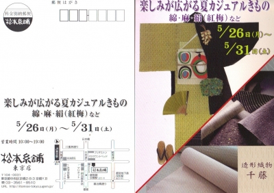 JUGEMテーマ:お着物&浴衣 日差しの強さに初夏を感じる今日この頃、 皆様いかがお過ごしでいらっしゃいますか。 松本糸舗では、普段着からちょっとしたお出かけまで 幅広くご活用いただけるカジュアルきものを集めて 「夏カジュアルきもの展」を開催致します。 綿、麻、絹、綿麻など、夏の肌に快適な感触で お手入れが比較的簡単、そして何よりお洒落! そんな着物をお探しの皆さま、ぜひおいでくださいませ! あの!千藤さんのステキ〜な帯も参ります。 浴衣も入荷しておりますよ。 2014年5月26日㈪...