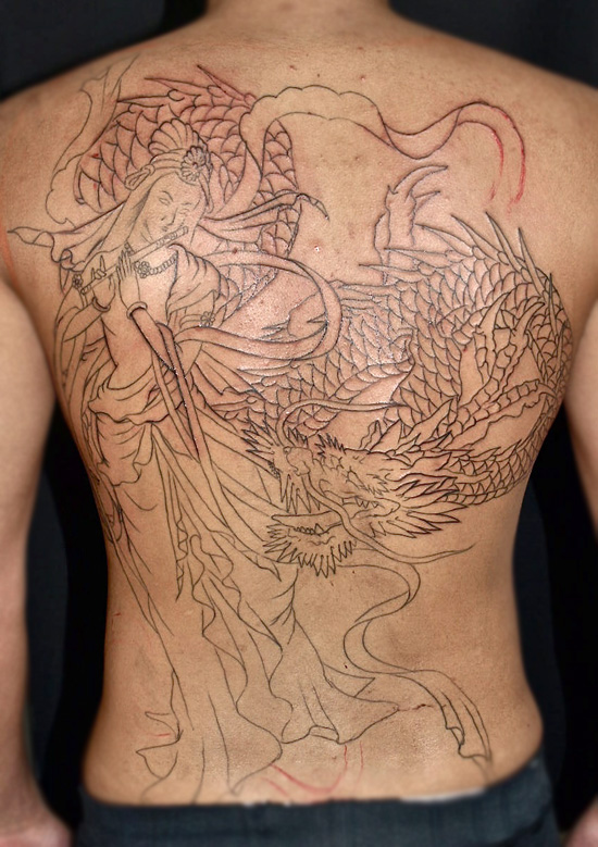 久しぶりの更新です! 最近は主にツイッター @yamatobonten の更新をしていました。 今回は背中のスジ彫りの紹介です。 この様な感じで 転写シールとフリーハンドで背中に絵を写して スジ彫りを彫ります。 天女の上半身と龍の顔は転写シール、それ以外はフリーハンドです。【続く】 JUGEMテーマ:刺青・タトゥー