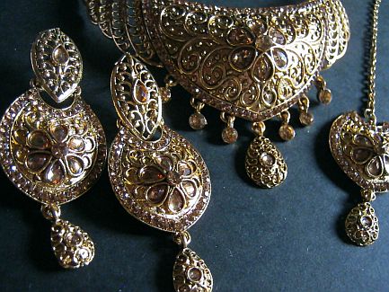 久々にインドのジュエリーセットを入荷いたしました('ω')ノ ので、引き続き今回の新商品 インドのアンティークデザインのアクセサリーセット をご紹介したいと思います。 『ジュエリーセット65−ゴールド』 インドダンス、ベリーダンスその他サルサ、ラテンダンスなどの衣装やパーティドレスにも合わせてお使いいただけるアクセサリーセットです 華やかな曲線で飾られた装飾にアールデコ調の優雅さが感じられるデザ...