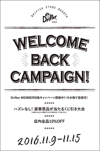 こんにちは。 今月に入り夜の冷え込みが強くなってきましたね、 名古屋では今日からさらに寒さが厳しくなってくるようです。 みなさん、しっかりと防寒対策をしていきましょう! さて、今日のブログはそんな寒さも吹っ飛ばす、 ホットな名古屋店限定イベントのご案内です。 ドリフターメンバーにご登録の方を対象に、 店内全商品10%オフに加え、ハズレなしのくじ引き抽選会を、 本日、11/9(水)〜11/15(火)の期間で開催します!! オリジナルノベルティやアクセサリー、 運が良ければ...