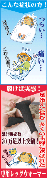 JUGEMテーマ:ダイエット・健康 冷え対策は、足先まで温かい血液を届ける事が重要です ふくらはぎを温めて冷え性改善!「専用ウォーマー」 つらい足冷えでお困りの方に!「専用レッグウォーマー」 いろいろ試してみたけど「どれも効果がない!」とあきらめていませんか? 累計販売数300,000足以上突破!人気の専用レッグウォーマーは 足冷えに悩む多くの主婦に、今も選ばれ続け、約90%の方が温かさを実感!! ふくらはぎは、栄養や酸素、免疫物など健康を維持する新鮮な血液を心臓から足先へ また反対に...