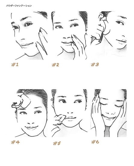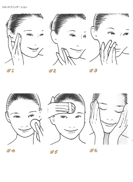 1下地 →顔全体に薄くのばす(場合によって省略可能) 2ファンデ→ほほから額 →顔タイプ別の方向でのばす 3細かい部分 →口元、目元、フェイスラインにのばす 4スポンジでなじませ →叩き込みながら全体をなじませる 5お粉 →顔全体にむらなくつける 6手のひらで密着 →ファンデを肌に密着させる チェック リキッドファンデーションは指の使い方がポイント。4点塗布ではなく、2〜3本の指の腹を使い重ねながらのばしてゆきます。指の使い方しだいで、カバー力、透明感の調節が自由にできます。 JU...