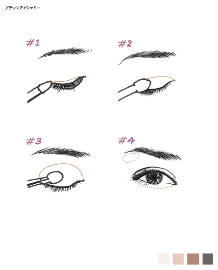 目元が引き締まり、ナチュラルからメリハリのまで、濃さの調節で目元の印象をかえられます。 1目のきわ → ダークカラー 2二重まぶた → ミデイアムカラー 3アイホール → ダークカラー 4下まぶたと部分的 → ハイライト チェック 下の色を上の色に重ねながら入れるのがポイント 目の形を変えてみせたい時は、ダークカラーの入れ方を工夫 下まぶたにも入れるれば、引き締まり感がアップ JUGEMテーマ:メイクの教科書