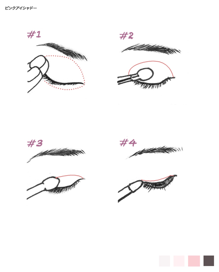 優しい、可愛らしい印象の目元を演出淡い色のパレットははこの入れ方でほぼ対応できます。 1まぶた全体と下まぶた → ハイライト 2アイホール → ライトカラー 3二重まぶた → ミディアムカラー 4目のきわ → ダークカラー チェック 色をきれいに見せたい時は、1が重要 色の発色を鮮やかに見せたい時は2でも指でつける 色を2〜3色に減らすとナチュラル感が増す JUGEMテーマ:メイクの教科書