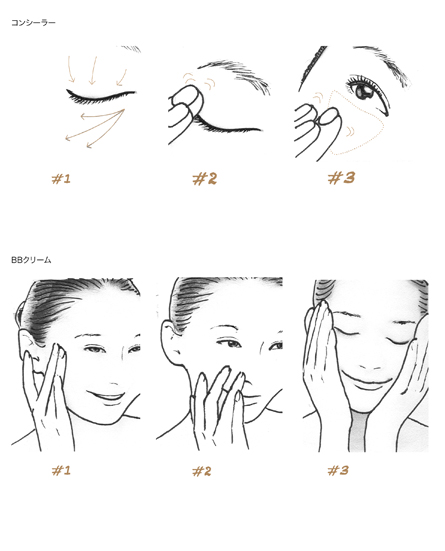 コンシーラー →部分用のカバーファンデ、目の周り以外にも使用 1つけるポイント 2まぶたの上になじませ 3目の下なじませ BBクリーム →手早く簡単に仕上げたいときに最適 1ほほから顔全体 2細かい部分 3手のひらで密着 チェック コンシーラーはファンデによって使う順番がかわります。 色選びは用途によりますが基本はファンデと同色が理想です。 JUGEMテーマ:メイクの教科書
