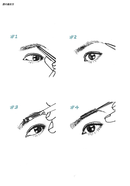 1下の部分を描く 2眉尻を描く 3パウダーで色を整える 4ブラシでぼかす アイブローアイテム 1,2アイブローペンシル 3アイブローパウダー 4スクリューブラシ 4眉マスカラ(より色を変えたいとき) チェック アイブローパウダーを重点に仕上げると印象が柔らくなります。 JUGEMテーマ:メイクの教科書