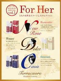 JUGEMテーマ:無添加スキンケア テラクオーレの2014クリスマスコフレが 間もなく販売開始されますよ。 第1弾となる「For Her」は、個性の異なる3人の女性像をイメージし、 3種の香りが登場です。 それぞれの香りをご紹介♪ ●NewRose(Romantic) 永遠の小女性と神秘的な小悪魔感を併せ持つ女性をイメージした香り。 ダマスクローズとイランイランがロマンティックに香ります。 ●Dolce(Happy) 輝く笑顔が周りの人をハッピーにするピースフルな明るい女性をイメージ。 バニラとシトラ...