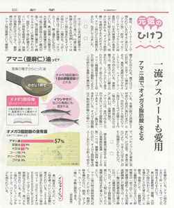 一流アスリートも愛用アマニ油でオメガ3脂肪酸をとる 10/31掲載 朝日新聞 元気のひけつから一部引用 最近、スーパーマーケットで売られているのをよく見かける「アマニ油」。昨年、サッカーのワールドカップブラジル大会直前に、日本代表選手の食卓をのぞいた時にもありました。成分に含まれる「オメガ3脂肪酸」を摂取するためだそうです。アマニ油にどんな効果があるのか、注目してみました。 サッカー日本代表は野菜サラダにかけて食べる。代表の専属料理人である西芳照シェフは「アマニ油に含まれるオメガ3が体にいい...