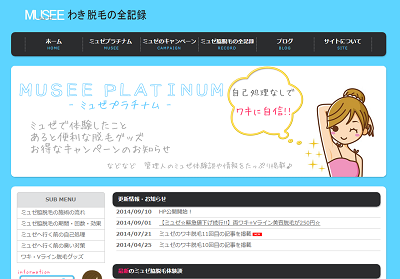 JUGEMテーマ:脱毛サロン ミュゼプラチナム 格安で通えて大満足の【ミュゼプラチナム】 コツコツ通っておよそ2年半で10回になりました。 今ではもう、自己処理は必要がない、綺麗な脇に 口コミ隊長のミュゼ体験談と、ワキ脱毛に役立つアイテムやミュゼのキャンペーンなどをまとめたサイトを作りました ミュゼが気になる人・ミュゼへ通っている人にも、役立つサイトになっています ミュゼわき脱毛の全記録-ミュゼで脇脱毛している私の体験を口コミします-