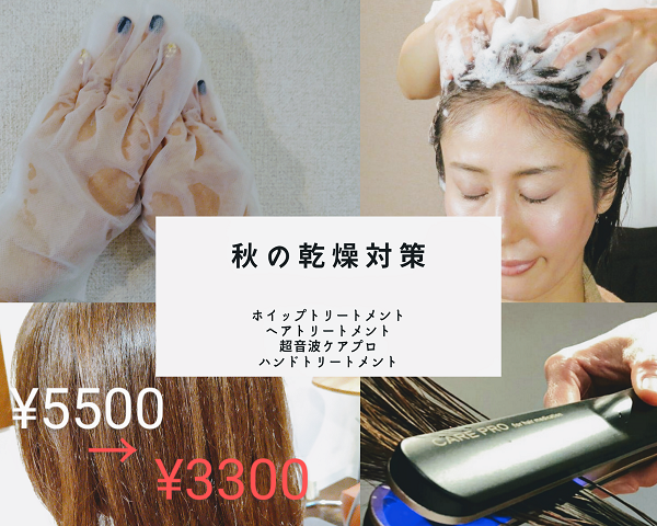 気持ち良い秋晴れが続くようですね。 カラリとして過ごしやすいですが乾燥も気になる頃です。 ●10月のスケジュール● 10月のお休みは毎週月曜日と6日(火)・20日(火)です。 ☆Mie bonheurでは秋のトリートメントキャンペーンが好評です! ・頭皮のエイジングケア(ホイップトリートメント) ・ヘアケア(3ステップヘアトリートメント) ・超音波ケア(ケアプロ) ・ハンドケア(美容液ハンドパック) 上記4点がセットに...