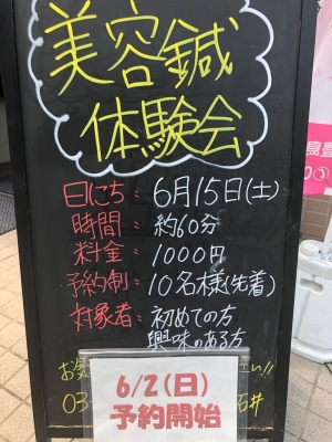 これまでも数回行って 毎回大好評を戴いている 美容鍼体験会 6月15日(土)に、実施します! お顔の気になるところを問診で伺って 30〜40本の鍼を使って改善します フェイスマッサージ等も併せて約1時間 こちらをお試し価格の1000円で体験して戴けます! ※終了後、アンケートにご協力ください 6月2日からご予約開始です! 空き時間の確認・ご予約は 03−3959−8070 メールだと確認が遅くなりますので 診療時間内...