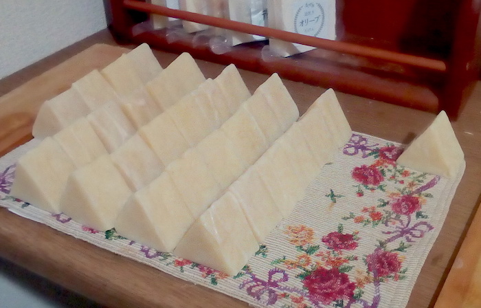 JUGEMテーマ:手作り石けん (文責:堀内) そろそろ在庫がなくなってきたおじゃるシャンプー、写真を見ると右端に1個だけありますが、隣にたくさんあるのは前日に作った新型です。少し製法を改良しました。 上の写真は新型(左)と従来型を並べてみたものです。写真では違いが分かりにくいですが、新型は新しい成形法を用い、より硬くなり、密度が高くなっています。そのため大きさはほぼ同じですが4%増量されています。使い勝手などは従来品と同じです...