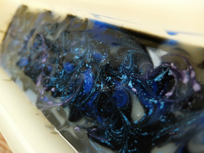黒とブルーのマーブルに、マイカを散らしたら宇宙っぽくなりました。 香りはパチュリとベルガモット、仕上がりが楽しみです。いつも応援ありがとうございます。 ↓ クリック♪にほんブログ村JUGEMテーマ:手作り石けん