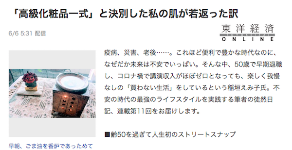 JUGEMテーマ:手作り石けん (文責:河野) 先日、ネットニュースに「高級化粧品一式と決別した私の肌が若返った訳」という記事を見つけました。50歳で早期退職し、コロナ禍による収入減で洗面所に化粧棚のない家に引っ越したため、高級基礎化粧品を捨てて「ごま油マッサージ」をはじめたが、肌にはなんの変化もなかった、というお話しです。 私も経緯は違いますが、2018年に手作り石けんを使い始めてから、ほぼ、基礎化粧品は使わず、石けんで洗うだけのスキンケア...