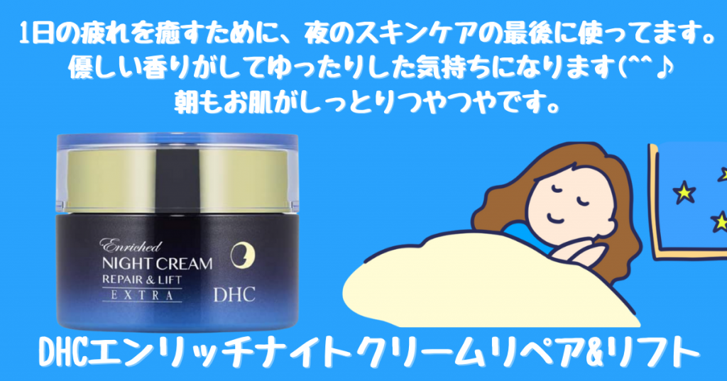 JUGEMテーマ:スキンケア 香りでリラックス☆ 化粧水の後にこれ1つでお手入れ完了。 今のお気に入りです。 【DHCエンリッチナイトクリームリペア&リフト】