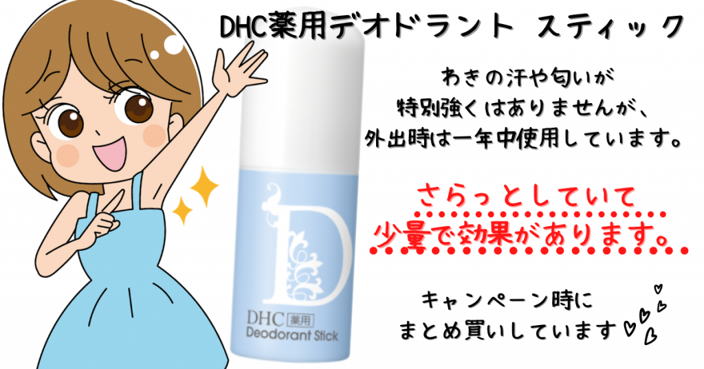 JUGEMテーマ:スキンケア わきの汗や匂いが特別強くはありませんが、 外出時は一年中使用しています。 さらっとしていて少量で効果があります。 キャンペーン時にまとめ買いしています。 【DHC薬用デオドラント スティック】