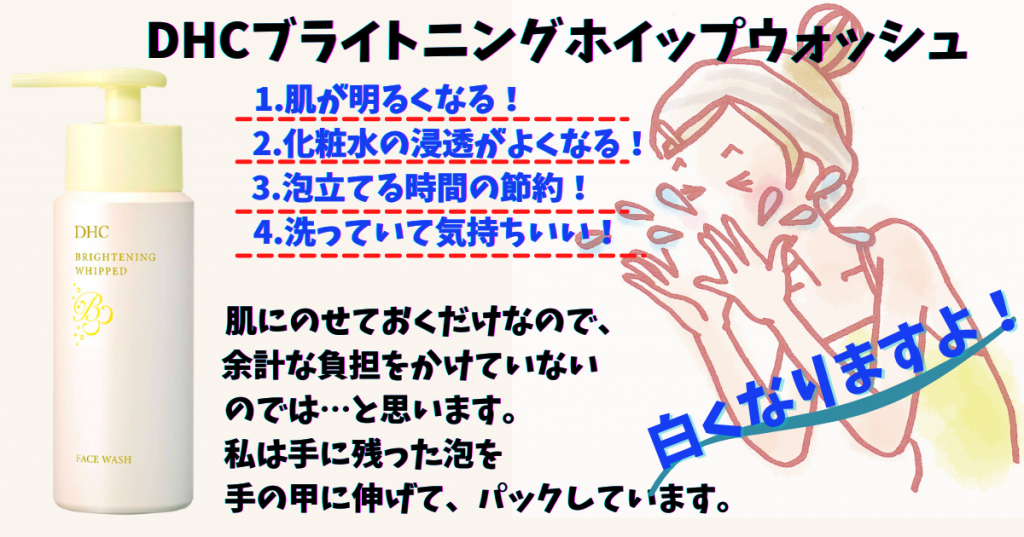 JUGEMテーマ:スキンケア 1.肌が明るくなる! 2.化粧水の浸透がよくなる! 3.泡立てる時間の節約! 4.洗っていて気持ちいい! 肌にのせておくだけなので、余計な負担をかけていないのでは…と思います。 私は手に残った泡を手の甲に伸げて、パックしています。 白くなりますよ。 【DHCブライトニングホイップウォッシュ】