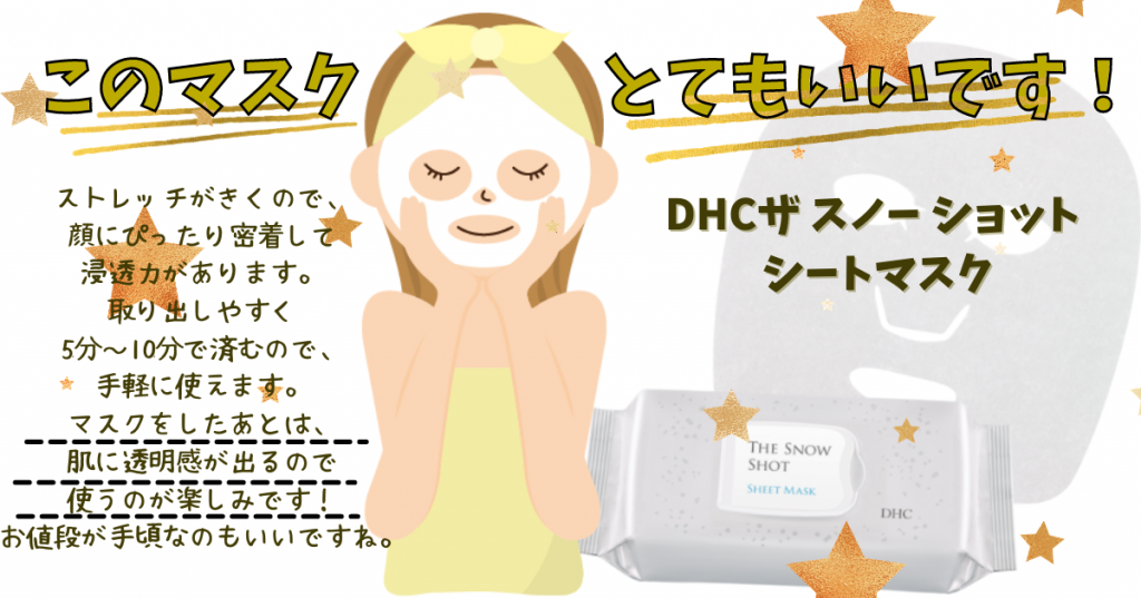 このマスクとてもいいです! JUGEMテーマ:スキンケア ストレッチがきくので、顔にぴったり密着して浸透力があります。 取り出しやすく5分〜10分で済むので、手軽に使えます。 マスクをしたあとは、肌に透明感が出るので使うのが楽しみです! お値段が手頃なのもいいですね。 【DHCザ スノー ショット シートマスク】