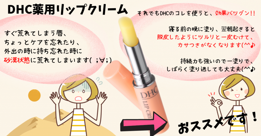 すぐ荒れてしまう唇、ちょっとケアを忘れたり、 外出の時に持ち忘れた時に砂漠状態に荒れてしまいます( ;∀;) それでもDHCのコレを使うと、効果バツグン!! 寝る前の晩に、塗り翌朝起きると脱皮したようにツルリと一皮むけて、 カサつきがなくなります(^^♪ 持続力も強いので一塗りで、しばらく塗り逃しても大丈夫(^^♪ おススメです! JUGEMテーマ:スキンケア