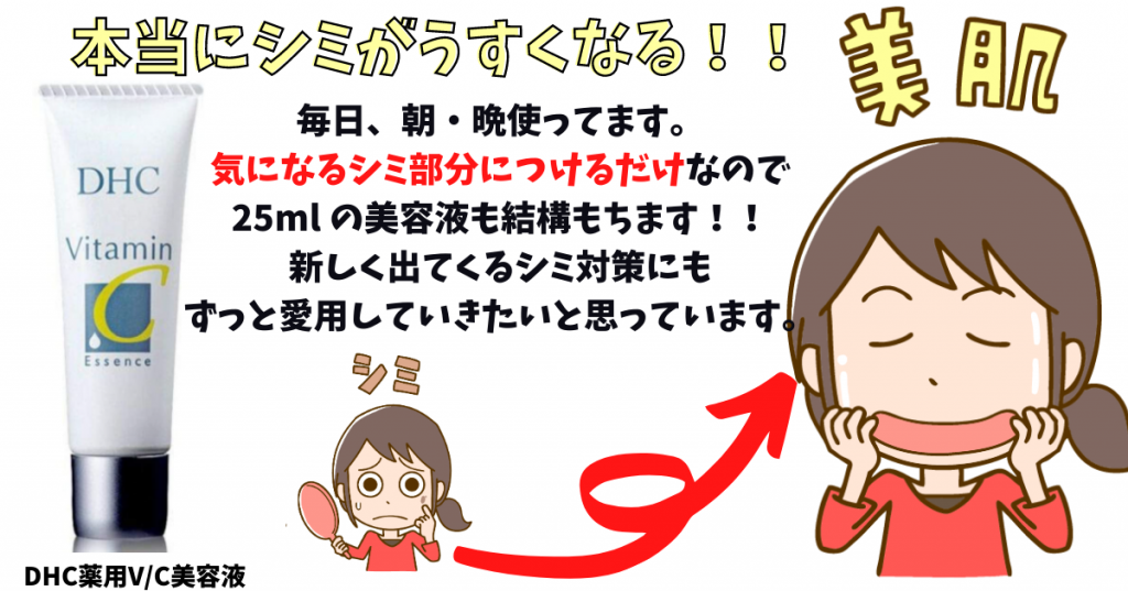 DHCビタミンcエッセンス 本当にシミがうすくなる!! 毎日、朝・晩使ってます。 気になるシミ部分につけるだけなので25ml の美容液も結構もちます!! 新しく出てくるシミ対策にもずっと愛用していきたいと思っています。 DHC さんありがとう〜!! JUGEMテーマ:スキンケア