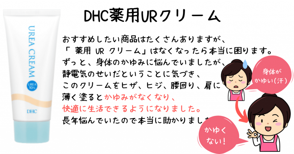 おすすめしたい商品はたくさんありますが、「 薬用 UR クリーム」はなくなったら本当に困ります。 ずっと、身体のかゆみに悩んでいましたが、静電気のせいだということに気づき、 このクリームをヒザ、ヒジ、腰回り、肩に薄く塗るとかゆみがなくなり、快適に生活できるようになりました。 長年悩んでいたので本当に助かりました。 JUGEMテーマ:スキンケア