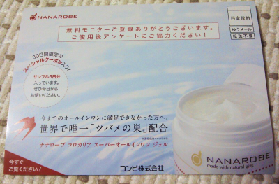 JUGEMテーマ:コスメ/化粧品 ナナローブ コロカリアスーパーオールインワンジェル posted with カエレバ Comolife Amazon 楽天市場 Yahooショッピング ヤフオク! 7net 無料サンプルを申し込んでました。使い心地をレビューしたいと思います。 ナナローブ コロカリア スーパーオールインワンジェルは ベビー用品のコンビが開発した、世界で唯一、高級素材のツバメの巣を配合したスキンケア商品。 コロカリアには肌の内部にあるコラーゲンを作る力、肌の光老化を防ぐ力...