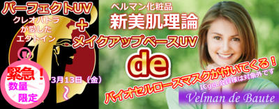 パーフェクトUV + メイクアップベースUV de バイオセルロースマスクが付いてくる!! [ベルマンICgeL会員様は対象外の企画です] クレオパトラの美肌の素だったかもしれないエクトイン 素肌の健康を第一義に考えるベルマンの新美肌理論 本当のスキンケアが出来る後悔しないUV対策はベルマン化粧品から! ベルマン化粧品オンライン通販の老舗 ベルマン・ド・ボーテ JUGEMテーマ:コスメ/化粧品