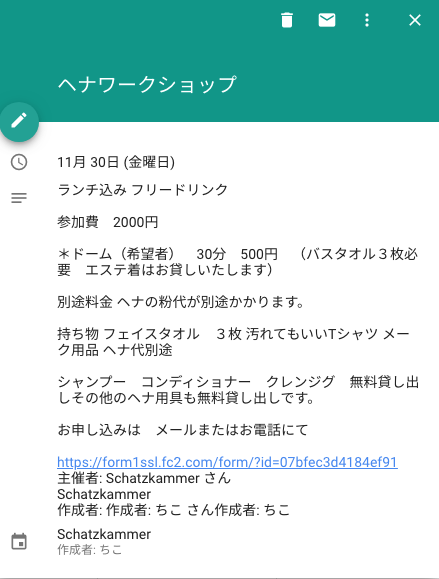 JUGEMテーマ:石鹸・シャンプー・化粧品 11月のヘナワークショップですが、イベント出店のため 第4週に開催ができません。申し訳ございませんが 11月30日(金)と12月1日(土)に 変更になりますのでどうぞよろしくお願いいたします。 お申し込み→フォーム