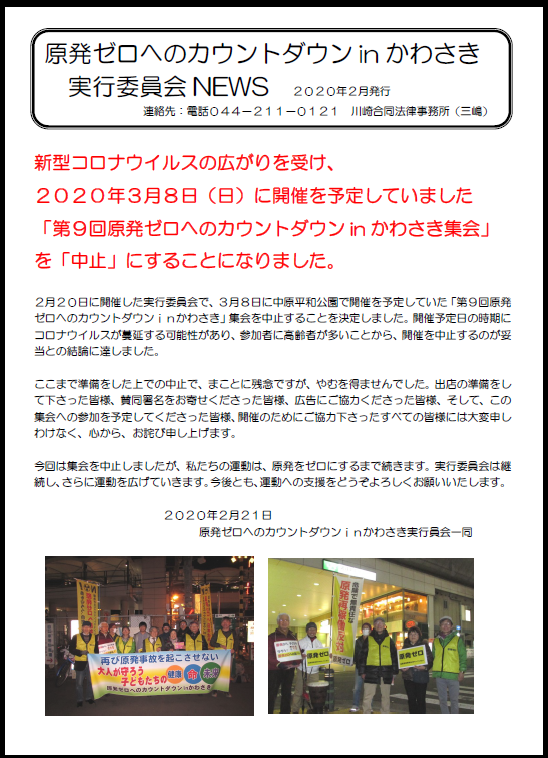 川崎市では、2011年3月11日の福島第一原子力発電所事故を契機に、毎年3月に「脱原発」「原発ゼロ」を訴える市民集会とデモがおこなわれ、毎回、1000名以上が参加しています。「原発ゼロへのカウントダウンinかわさき」という名称の運動で、思想・信条・支持政党の違いを超えて「原発ゼロ」の一致点で集まった市民による実行委員会で運営されています。 昨年は1300名が「原発ゼロへのカウントダウンinかわさき」に参加しました。 私は事務局長として、今年も3月8日(日)に「第9回 原発ゼロへのカ...