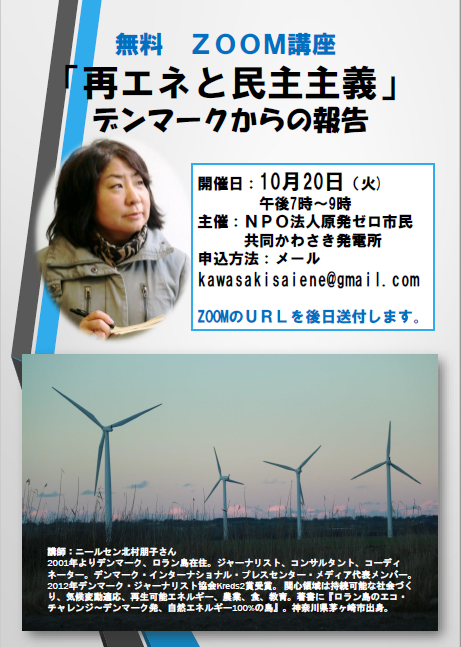 私も理事として参加しているNPO法人原発ゼロ市民共同かわさき発電所の主催で、2020年10月20日(火)午後7時より午後9時まで、ZOOMを使ったオンライン講座を開催します。 テーマは『「再エネと民主主義」デンマークからの報告』です。 事前にメールで申し込みいただければ、誰でも無料で参加できます。 オンライン講座でZOOMを利用するため、スマートフォンもしくはパソコンを使い、ご自宅から参加する形式です。 講師は、デンマークに19年以上住んでいる、日...
