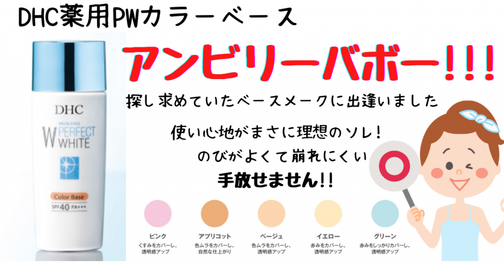 JUGEMテーマ:コスメ ・美白スキンケア効果 ・UVカット ・コントロールカラー ・化粧下地 の4つの機能が1つになったカラーベースはとても肌がきれいになります。 これ一本で肌が明るく、くすみやシミがキレイにカバーできます。 もうこれなしではメイクできません!! 皆さんぜひお試しください。 すごくイイですよ。 肌がきれいに仕上がる!【DHC薬用PWカラーベース】