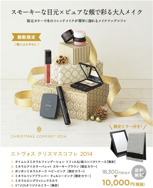 ※ご好評につき、クリスマスコフレ2014は完売いたしました。 再販の予定はございません。 店頭限定リミテッドコフレは、店舗によりまだ在庫がございますのでぜひお早めにお求めくださいませ。 こんにちは、エトヴォス福井です。 11/20 12:00 よりクリスマスコフレ2014の通常発売を開始いたします。 (12:00はお昼の12:00です。) 予約分では予想を超える人気で予定していた数量では足りず、急遽数量を追加しましたが5日足らずで終了となってしまいました。 今回の通常分も数量限定ですのでご購入はお早め...