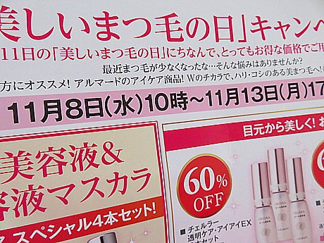 JUGEMテーマ:気になるコスメ 今日はアルマードさんのまつ毛美容液とマスカラがキャンペーンで60パーセントオフになってますんで、そのご紹介です。 毎年ですがアルマードさんは11月11日の美しいまつ毛の日にちなんで、まつ毛美容液とマスカラのキャンペーンをされます。それがまた、1年でこの時が一番安い。 アルマードさんは何を言っても高いんでね、以前から試してみたいなあとか思ってた方、このお得な機会に購入されるのをおすすめします。 ...