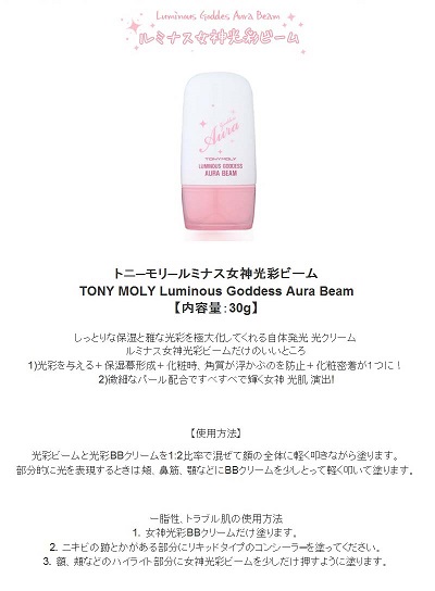 JUGEMテーマ:韓国コスメ TONY MORY AURA BEAM(化粧下地) ¥1100(+税)入荷しました♪ 韓流コスメ・韓流グッズのお店がオープン!! 店頭販売強化中!! エッセンスマスク各種品揃えボリュームアップ! BIGBANG EXO INFINITE ファン感謝祭開催中!! 店頭特設コーナーへ急行!!エコランド ネットショップへGO ⇒:エコランド 韓国から直輸入! 人気ドラマ俳優グッズ。 人気のK-POPアイドルグッズが盛りだくさん。 CD、DVD、コスメも続々入荷中!! 2014年 カレ...