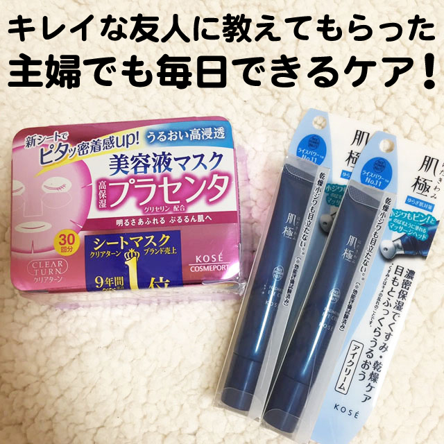 育児ブログぷっぷくほっぺにようこそ! ぷっぷくの母(@ky0nzi)きょうこです。 年明け友人宅の忘年会とやらに参加させてもらいました 大人たちは3時とかまでお喋りしちゃって もう本当に楽しい会だったのですが ジムや美容をしっかりやってる友人の話を聞いて 「やばい、わ…わたしも…やらな!」と 我に返ったのです。 とにかく「時間が無くてもやった方がいいよ!」というアドバイスを受け 主婦でも続けられるスキンケアを教えてもらいました! それがコチラ 美容液マスク ▲コー...