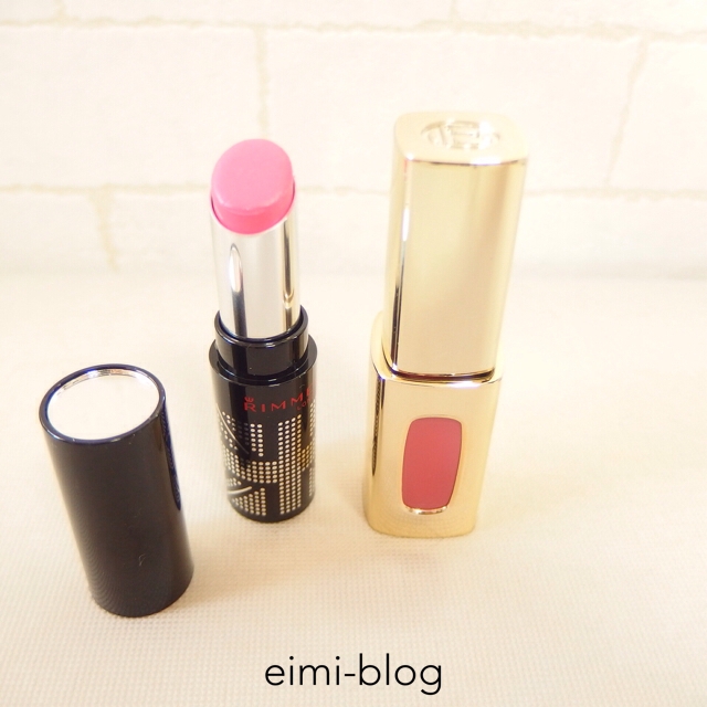 少し前に買った口紅とグロスです。 前まではチークを濃いめにして リップはひたすらヌードカラーだったのですが 少し前からリップの方に色味を持ってきて チークはうす〜くなってきています。 左:リンメル ラスティングフィニッシュクリーミィリップ 005 右:レブロン カラーリッシュ エクストラ ルージュ 101(ROSE MERODY) リンメルの方は実際はもっと色味が強いです。 同じ商品で002番の色も持っているのですが、 個人的にはこの2つの中間色が欲しい!! なので今はこの2色を重ね塗りしています('Д') ...