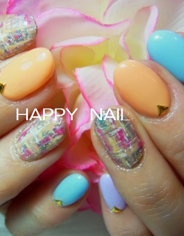 近鉄八尾でのネイルといえば・・・ やっほー ハッピーネイルです ネイルメニュー 料金は こちら ハッピーネイルへの アクセスは こちら ご新規 A 様の 素敵ネイルです ネイル大好きで 毎月 いろんなカラーや デザインで 楽しんでおられます 今回は 癒しのふんわりカラーに 目を付けられました キラーン 今年 流行りのツイード柄を いろんなデザ...