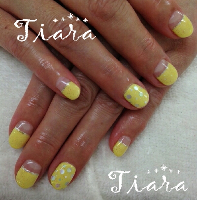 こんにちわ^ ^スタッフ遠藤です。 黄色のストレートフレンチです! 上からラメをかけて、キラキラに★ オールカラーのところは ホログラムを置いてみました(^o^) 戸越銀座店、カラーがとても充実していて、 選ぶのに困ってしまうくらいたくさんありますよ*(^o^)/* JUGEMテーマ:ジェルネイル JUGEMテーマ:春色ネイル