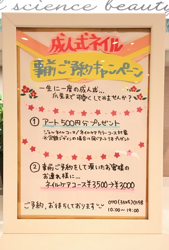 JUGEMテーマ:ネイルブログ こんちには♪ ネイルネイルららぽーとTOKYO-BAY店です! 11月も残すところあと3日となりました。 なにかと忙しいこの時期… 素敵なネイルで癒されませんか☺? 今日は成人式キャンペーンのご紹介です。 店頭でも、成人式ネイルのご相談が増えてきました! 成人式間近はご予約が取りにくくなってしまいますので お早めにご予約をお願い致します✨ 皆様のご来店を、...