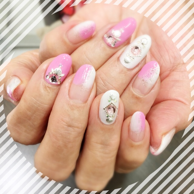 JUGEMテーマ:ジェルネイル JUGEMテーマ:ネイルブログ こんにちはネイルネイル東員店です 本日も素敵なお客様ネイルのご紹介です まずはこちら 肌なじみの良い優しいピンクのグラデーションです 薬指のゴールドパーツが華奢で可愛いです 続いてこちら 定額デザインよりお選び頂きました 涼しげなブルーがこの暑い夏にぴったりです お次はこちら 定額デザインをカラーチェンジされました 涼しげな青と白にクリアの...