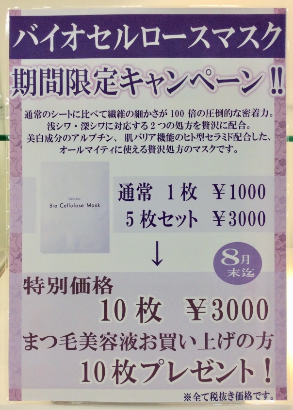 皆様こんにちは💓 ネイルネイル鶴見緑地店です☆ 太陽の日差しが容赦なく照り付けるこの季節‼ 外は暑いけど、仕事場や建物の中はクーラーで冷えて、 体もだるいし、お肌は乾燥してパリパリ、そして毎日の日焼け…なんか顔が疲れてる… そんな方!必見です! バイオセルロースマスク(顔用) がなんと8月末までの期間限定10枚3000円です!!!!!!! (通常価格 5枚 3000円) ※全て税抜き価格です。 さらに!!...