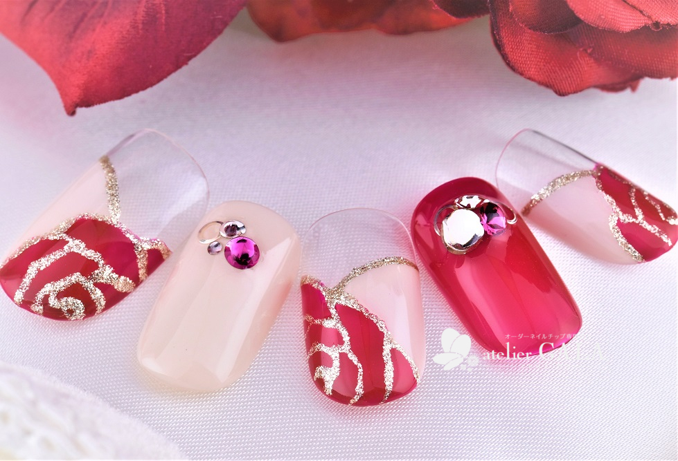 JUGEMテーマ:オーダーネイルチップ こんばんは。 今日はクラシカルなデザインのウェディングネイルを紹介します。 大胆にカメリア柄を描いたとっても大人なデザインです。 ローズレッドとの組み合わせにはミルクティーベージュを持ってきて、柔らかさもプラスしました。 シックな雰囲気のドレスにオススメです。 でも赤色系の打掛にも合わせられそうですね。 明日...