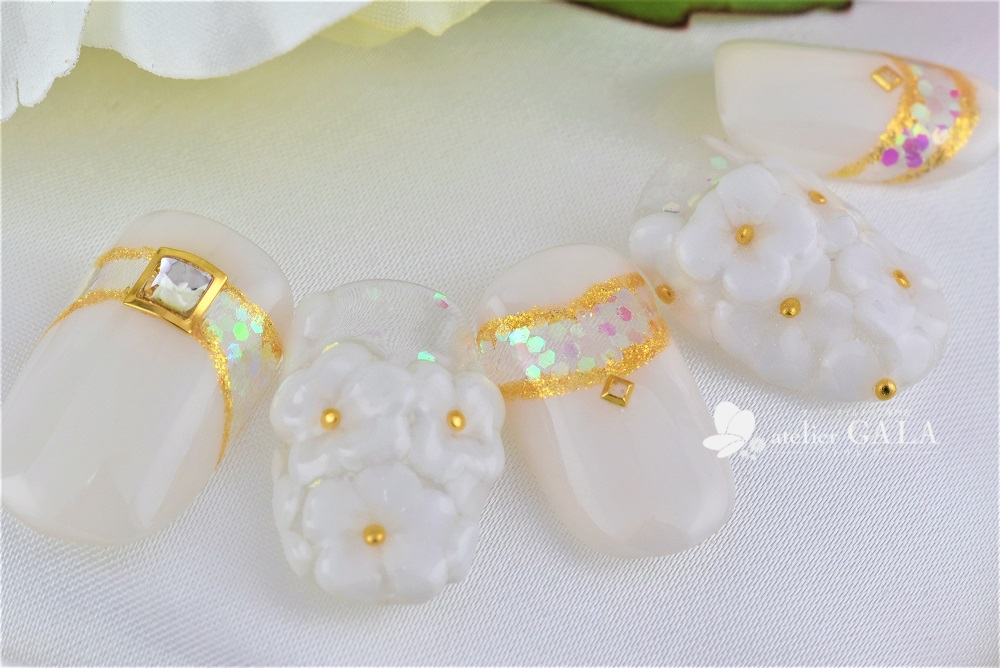 JUGEMテーマ:オーダーネイルチップ こんばんは。 今日は、3Dフラワーをたっぷり敷き詰めたウェディングネイルの紹介です! ホワイトのかわいい3Dのお花を隙間なく敷き詰めました。 組み合わせのホワイトネイルは、一部分をクリアで残し、オーロラに輝くホロを敷き詰め、ゴールドラインでシンプルでも華やかなデザインに仕上げました。 私の手に乗っけてみました♪(ごつい手ですみません。し...