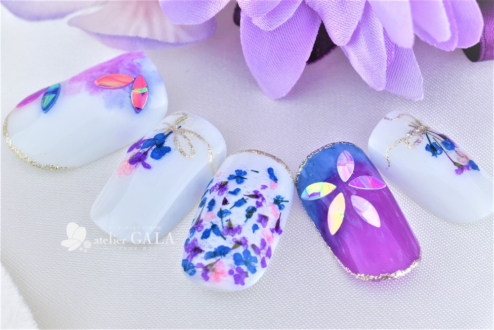 JUGEMテーマ:オーダーネイルチップ こんばんは。日が変わる時間ぎりぎりの投稿になってしまいましたm(_ _"m) 今日は、今人気の押し花を使ったネイルの紹介です。 パープルとネイビーの小花の押し花を、小さな花束にしたり、フラワーシャワーにしてみました。 アクセントにキラキラホログラムを乗せて、華やかさもプラス。 白をベースにしているので、かわいい押し花が、爽やかで大人っぽく仕上がりました。 ...