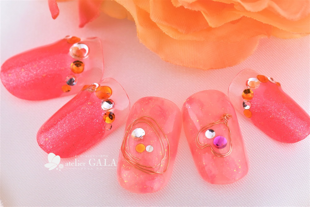 JUGEMテーマ:オーダーネイルチップ こんばんは!今日も日が変わるギリギリですね(T_T) さて、今日はとってもジューシーなウェディングネイルの紹介です。 グヮバジュースのようなビタミンたっぷりのジューシーなカラーの変形フレンチネイルです。 組み合わせには淡いオレンジの天然石、またはゼリーのようなマーブルに、今トレンドのワイヤーで遊び心を加えてみました! トレンドに敏感なおしゃれな花嫁様にオススメです! ...