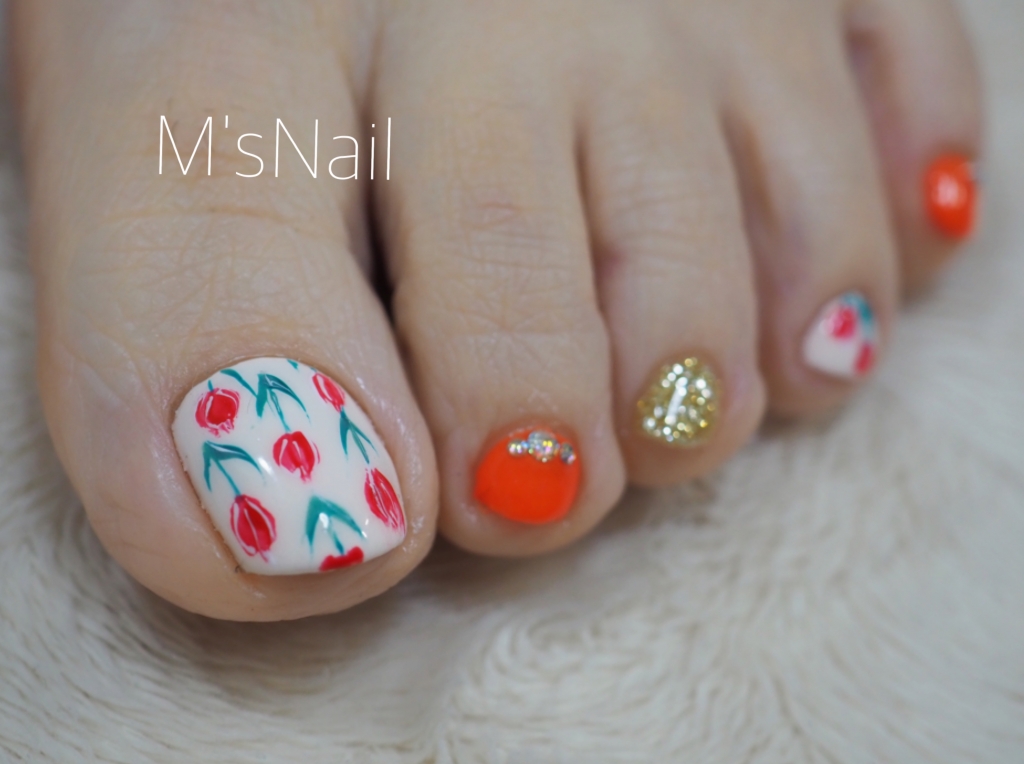 JUGEMテーマ:ジェルネイル 春らしいチューリップ柄のフットネイル 足先から春を感じますね☆ 定額フットネイル¥9500 (通常価格10.000→9500) (ジェルオフ、フットバス、甘皮ケア)もついて大変お得になっています。 その他定額フット¥8500もございます☆ ホットペッパービューティーより24時間ご予約受付中☆ M'sNailホームページ