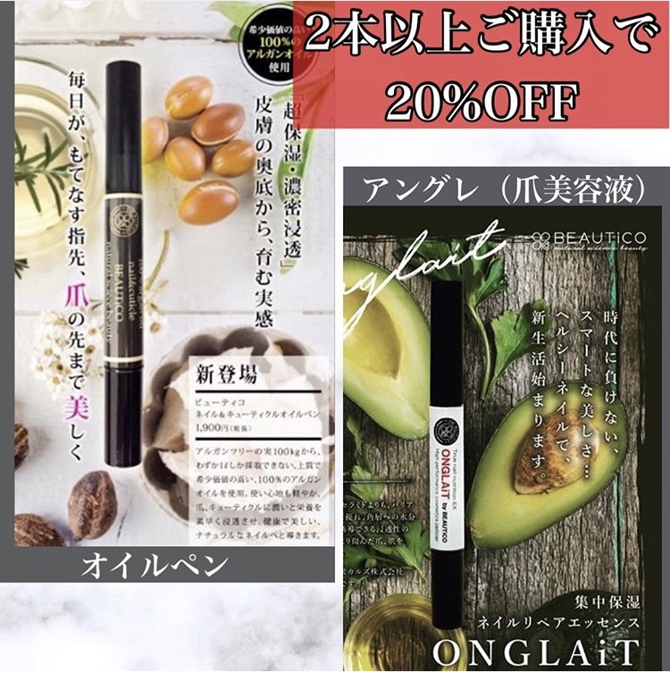 JUGEMテーマ:ジェルネイル こんにちは!ネイルネイル東員店です♪ 本日はお得なキャンペーンのご紹介です☆ アングレ(爪美容液)、キューティクルオイルペン2本以上ご購入で20%OFF!! 組み合わせは自由にお選び頂けます。 期間:11月末まで お得なこの機会に是非お越し下さいませ☆ 皆様のご来店お待ちしております。 明日は10時、14時以降空きがございます。 お電話お待ちしております! ?:0594-88-5228 【営...