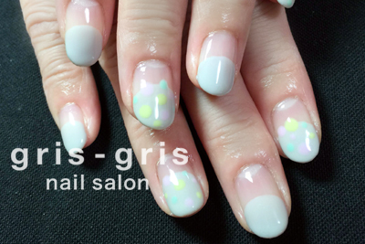 ペールグレーのオーバルフレンチです。そこに、肌なじみの良いピンク、イエロー、グリーンの大きさの違うドットをちりばめました。ほわんとした柔らかいイメージのネイルの完成です。参考価格¥7600桜新町 用賀 ネイルサロン グリグリJUGEMテーマ:ジェルネイルJUGEMテーマ:カルジェル Calgel