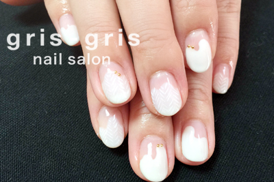不思議な形のフレンチです。スケルトンにしたホワイトの上にはヘリンボーンを描きました。さり気なく凝っていますが、シンプルにまとまったフレンチです。参考価格¥7400桜新町 駒沢 ネイルサロン グリグリJUGEMテーマ:ジェルネイルJUGEMテーマ:カルジェル Calgel